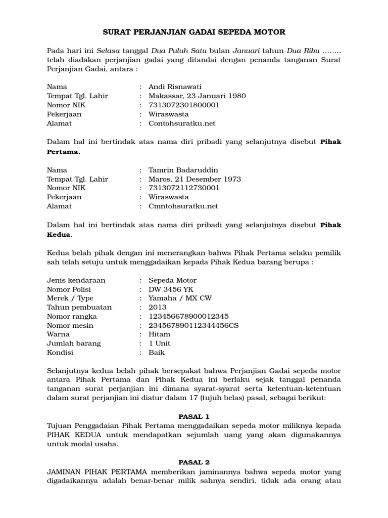 Berikut adalah contoh surat perjanjian penggantian rugi materai: